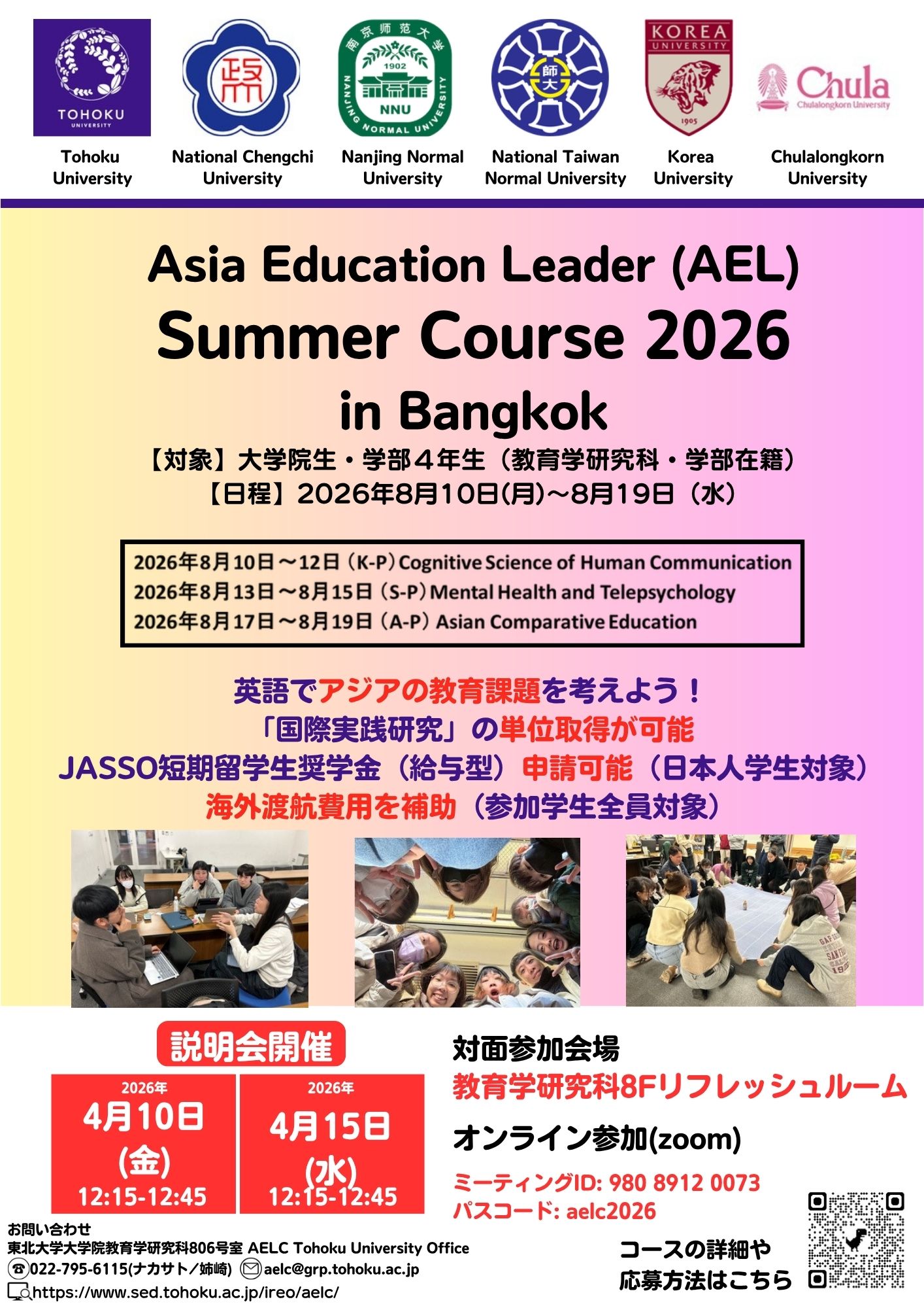 The Summer 2026 AEL Course will be hosted by Chulalongkorn University and Tohoku University in Bangkok this August. For those considering applying for the Summer 2026 Course, participation in one of the following hybrid orientation sessions is mandatory. No registration is required.