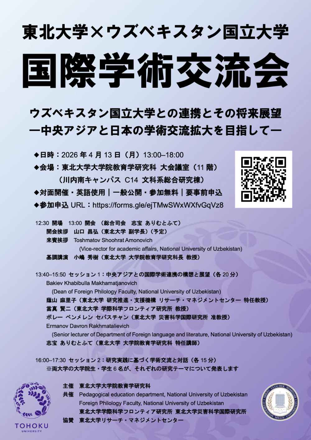 「東北大学×ウズベキスタン国立大学国際学術交流会」は、将来的に両大学の連携を実現するための第一歩として、情報共有や意見交換を行うことを目的とした企画です。今回の交流会では、まず「中央アジアとの国際学術連携の構想と展望」と題し、議論を行います。そのうえで、「研究実践に基づく学術交流と対話」のセッションを設け、両大学の研究者や学生を中心に、それぞれの研究発表を通じた学知の共有を図ります。